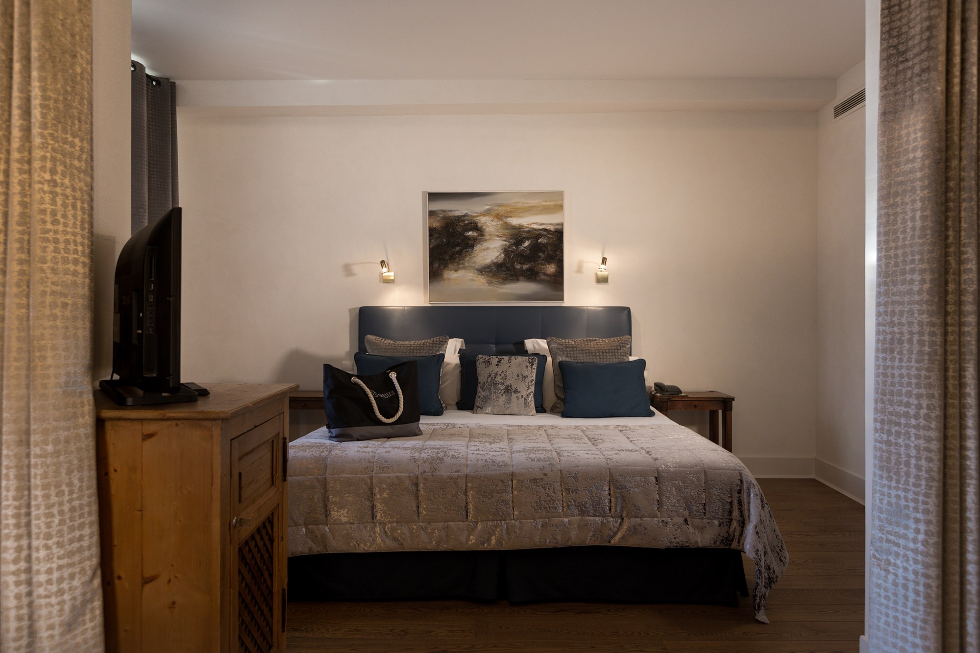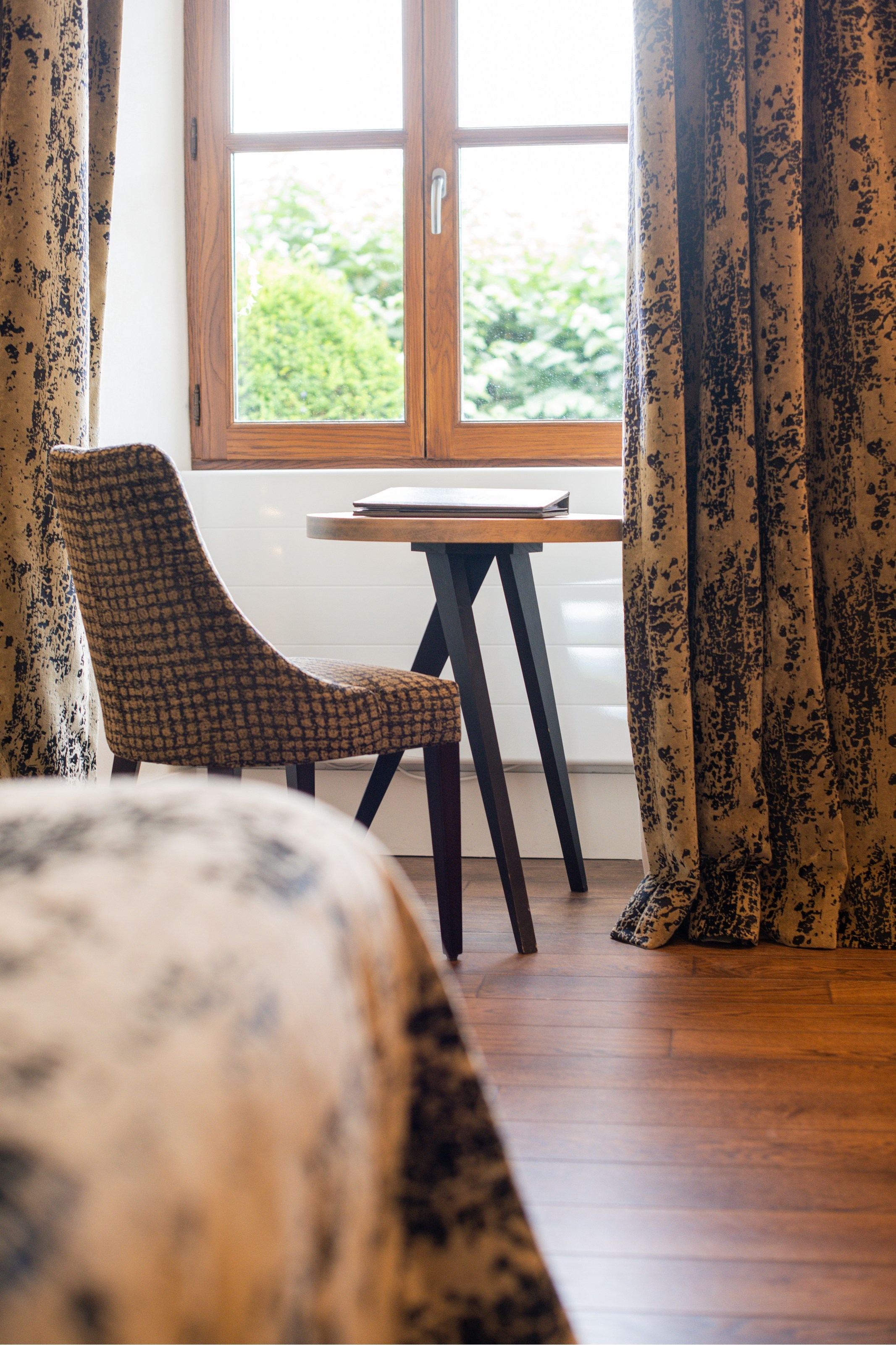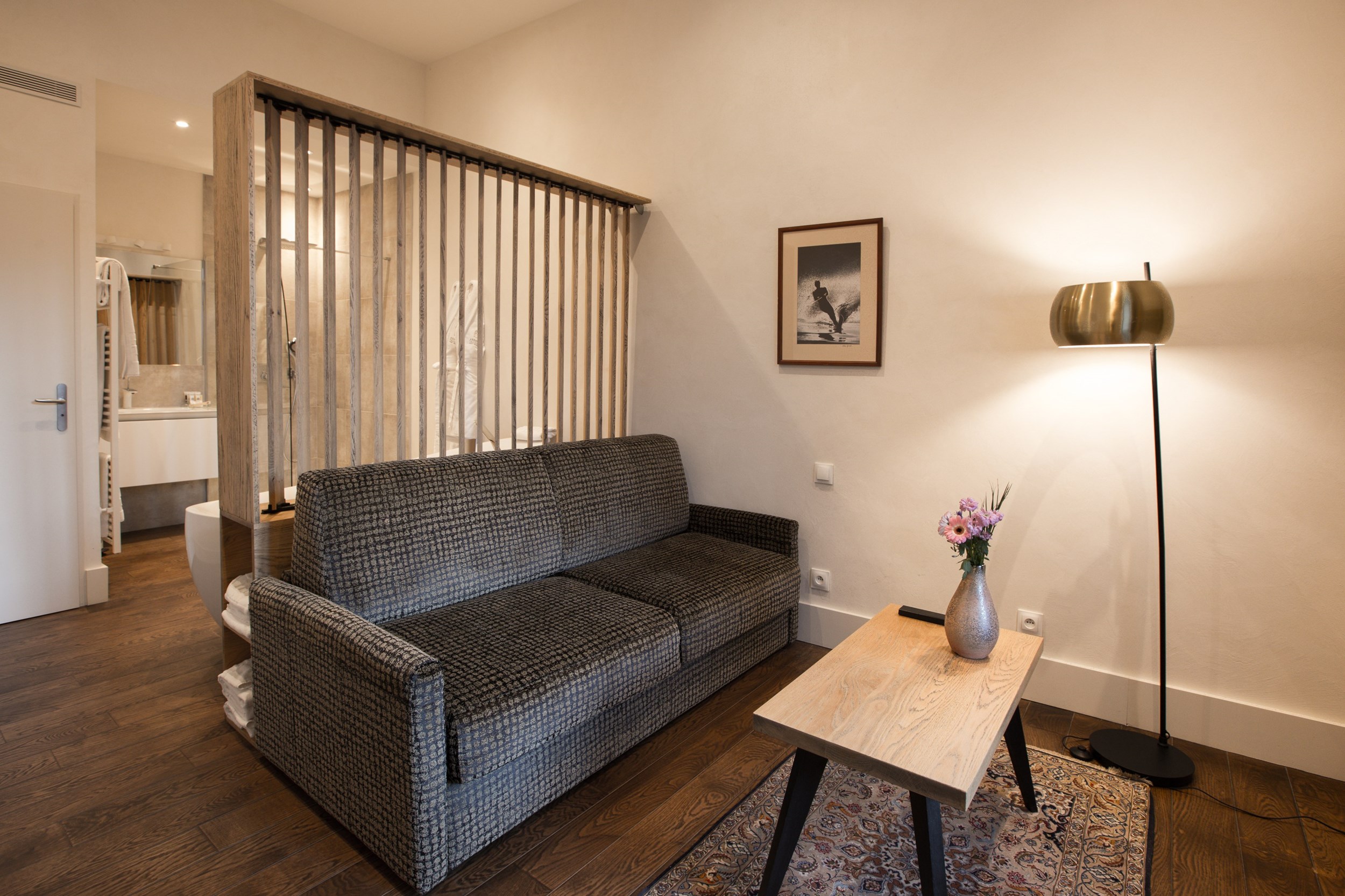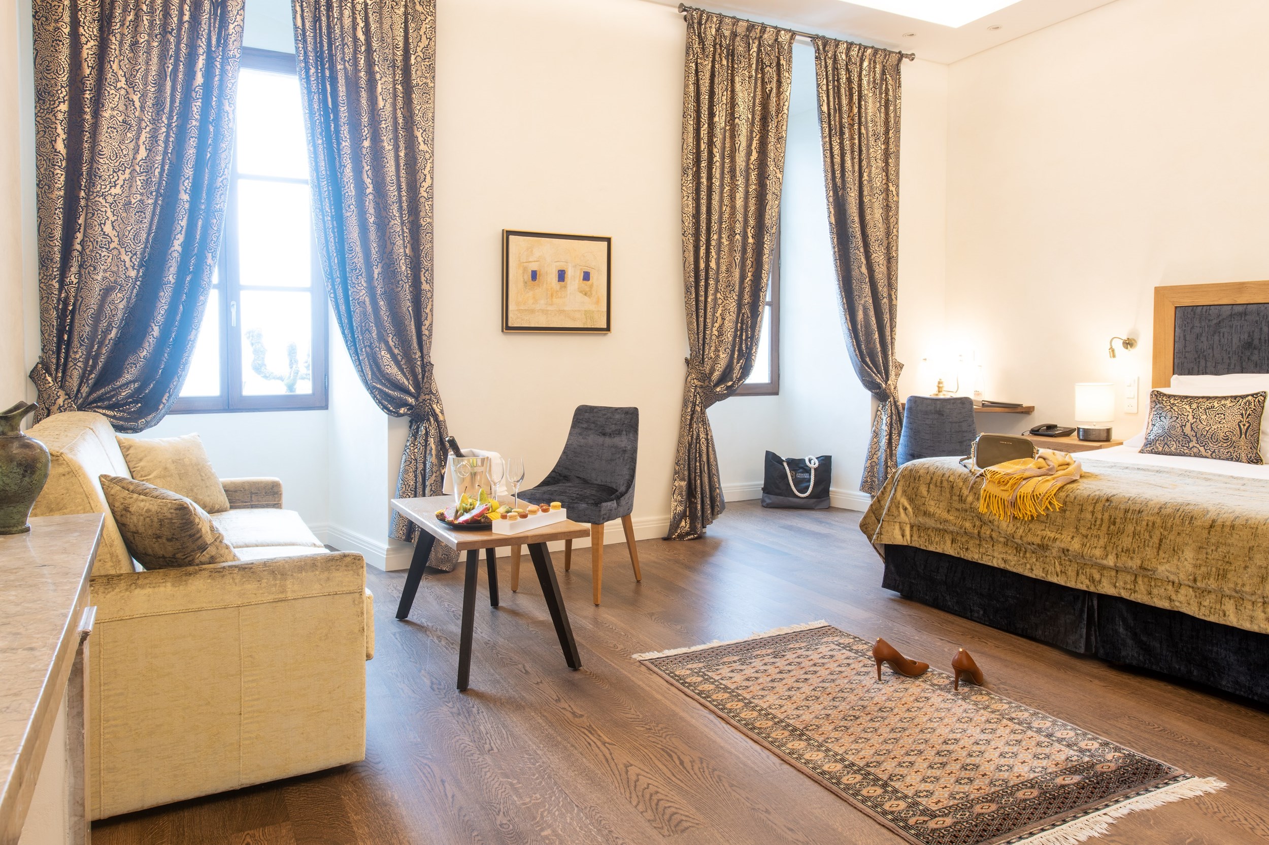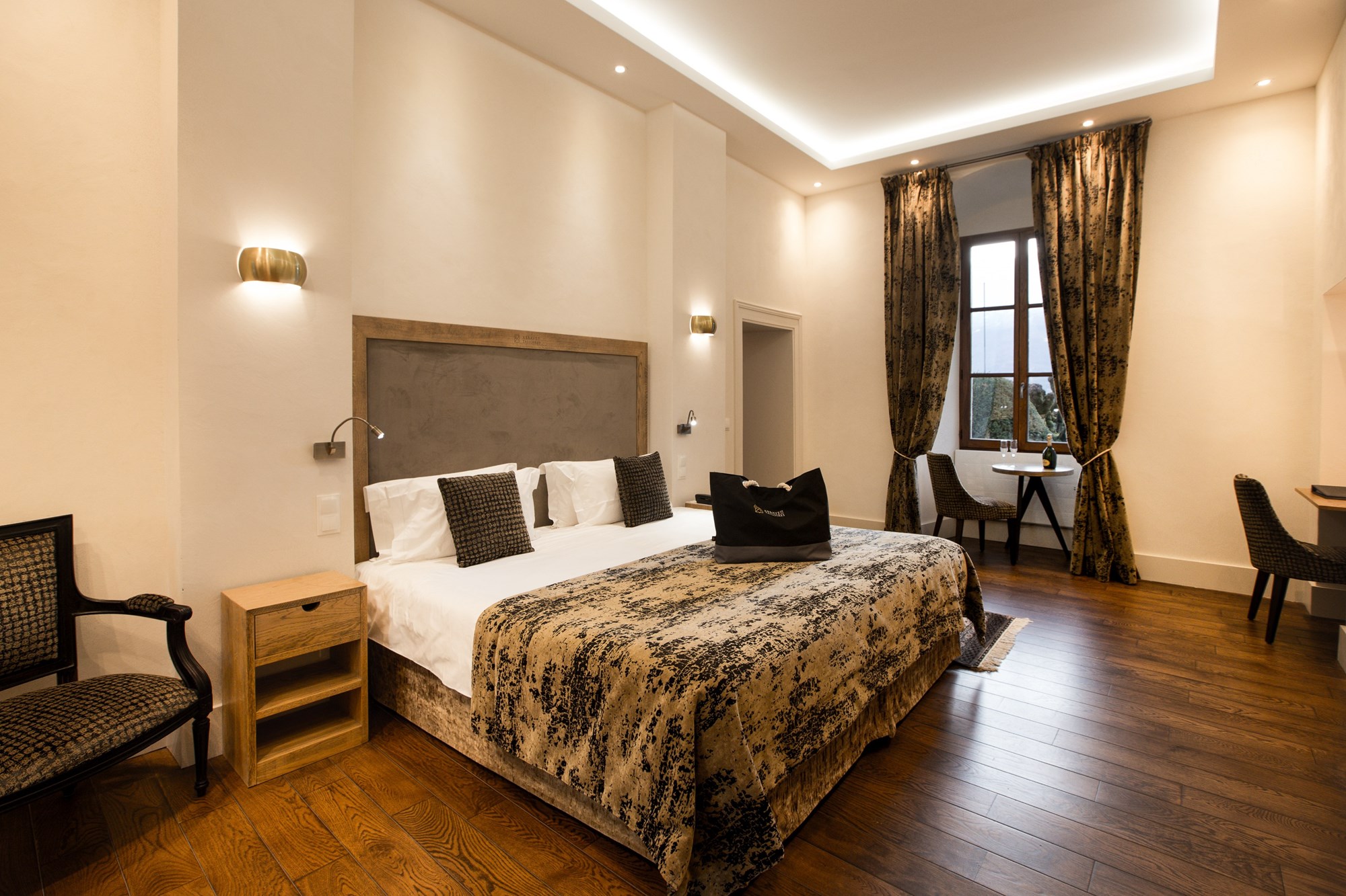 Dernière création de l’Abbaye, inaugurée en février 2023 et aménagée à l’emplacement de l’ancienne réception, cette suite située au rez-de-chaussée bénéficie d’une vue directe sur le lac. Sa décoration soignée et singulière lui confère une atmosphère élégante et onirique, véritable invitation au voyage.